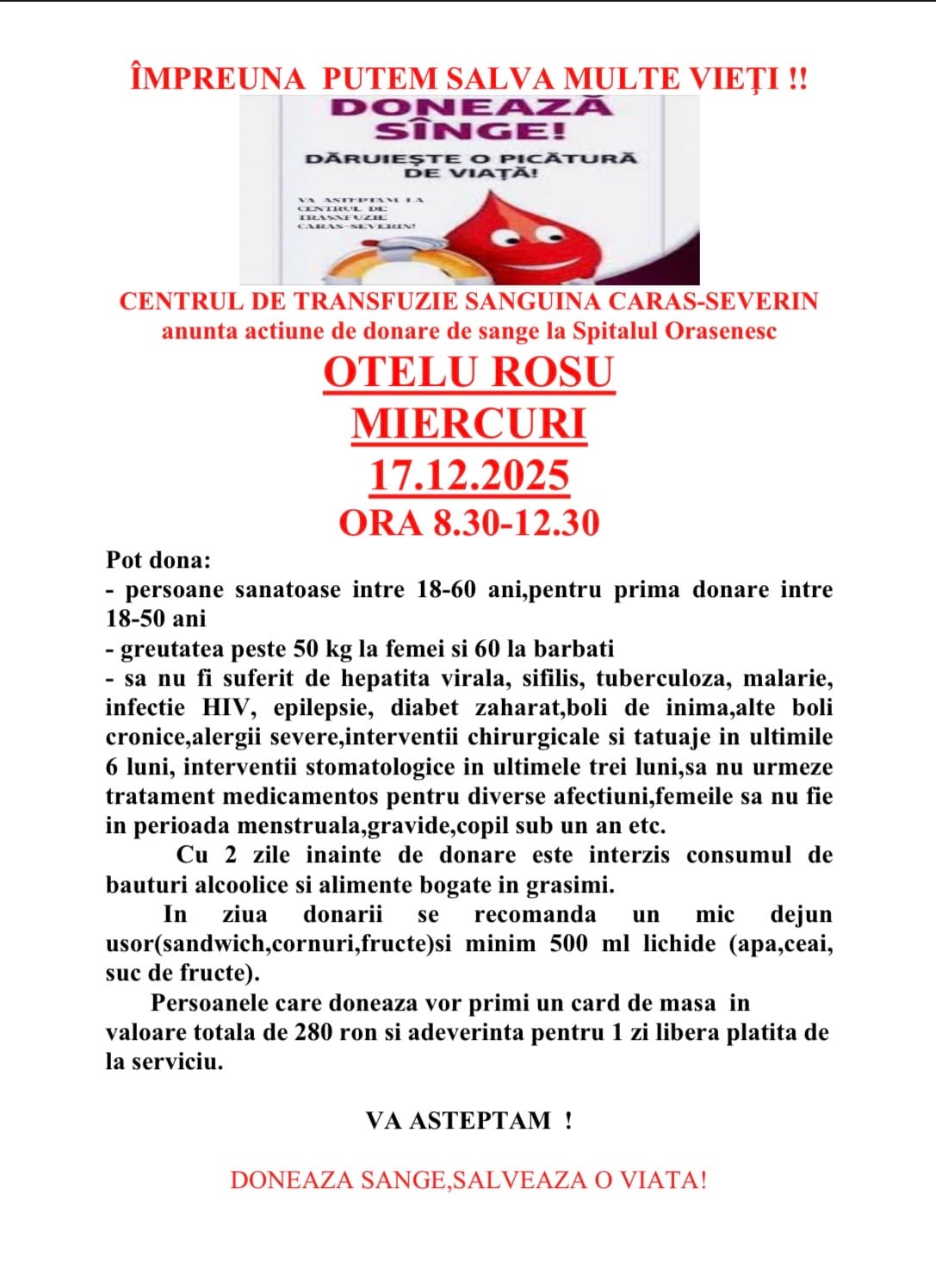 Centrul de Transfuzie Sanguină Caraș-Severin își întinde o chemare autentică: „Vă așteptăm! Donați sânge, salvați o viață!”. În 17 decembrie, la Oțelu Roșu, fiecare braț întins devine o promisiune. O promisiune că viața, în fața nevoii, poate conta pe cea mai profundă formă de solidaritate: cea care vine direct de la o persoană la alta, fără intermediari, în cea mai pură expresie a umanității.